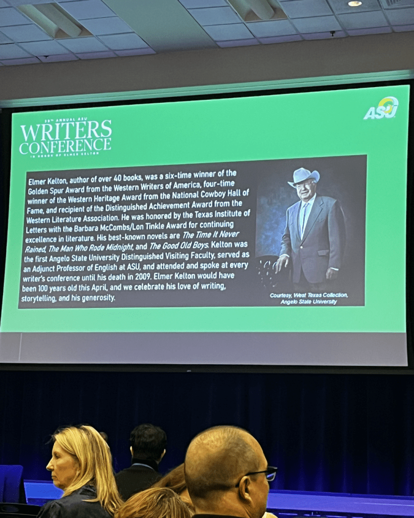 Kelton is a seven-time Spur Award winner (not the six times the university inaccurately cited at the conference), a winner of four Western Heritage Awards, and was voted the best western author of all time by the Western Writers of America. He wrote 47 fiction novels, six short story collections, and 14 non-fiction books. Most of these he wrote part-time in the evenings. He was a WWII veteran, a graduate of the University of Texas, and worked for a collective 42 years at the San Angelo Standard-Times, Sheep and Goat Raiser Magazine, and as associate editor of Livestock Weekly. Most importantly, he was a husband, a father, and a churchman.
